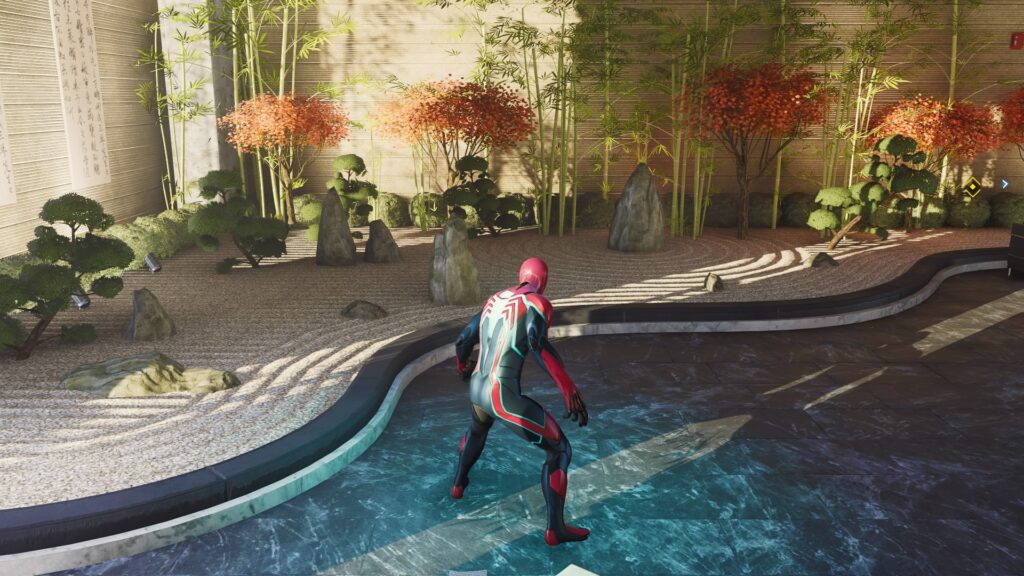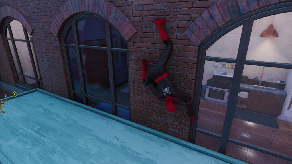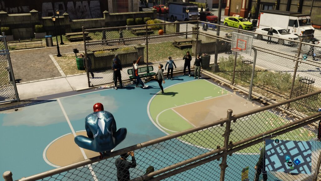 他にも個性的な建物やビルのガラスの奥に見える部屋ごとの内装まで細部にわたり描画されてたり、街のストリートではバスケを楽しんでる人たちまで表現されていたりとか、SIEとMarvelの看板を背負っているタイトルの本気さが伺えます。