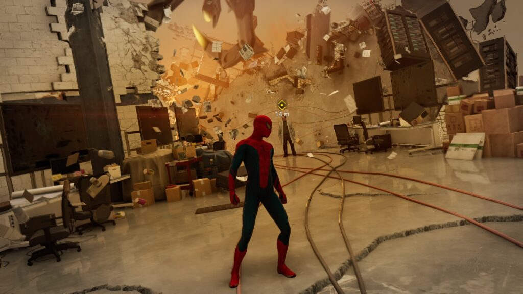 通常状態ではカメラ距離がしっかり遠目になっていることや、スパイダーマン自身が激しく動いてもある程度カメラワークが一緒にガタガタ揺れないようになっているのが大きな要因なのかなと思います。