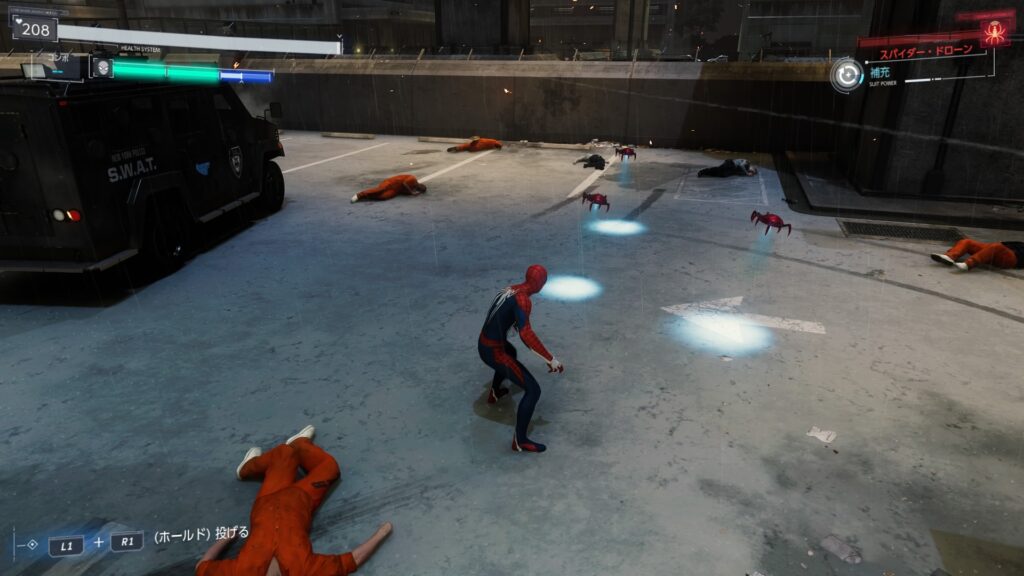 小型ドローンに援護射撃させたり、敵を宙へ浮かせたり、爆発してウェブを一気に多人数に巻き付けるなどガジェットによる攻撃は使いこなせば便利なものばかりです。