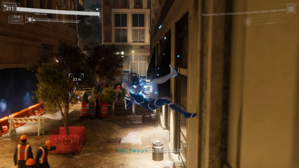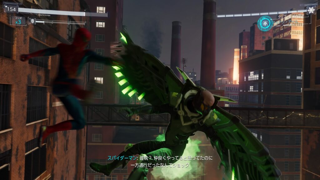 ビル間だけでなく戦闘中も建造物が近くにあればいつでも同じようにウェブスイングなどができるので敵を撹乱しながら縦横無尽に攻め込めこむのが楽しいです!